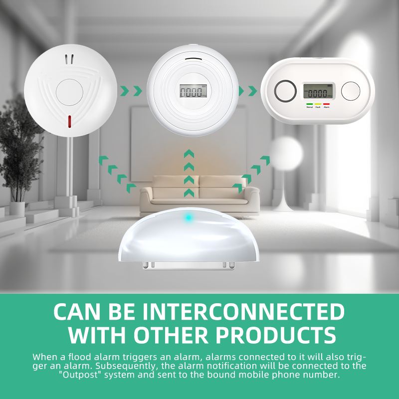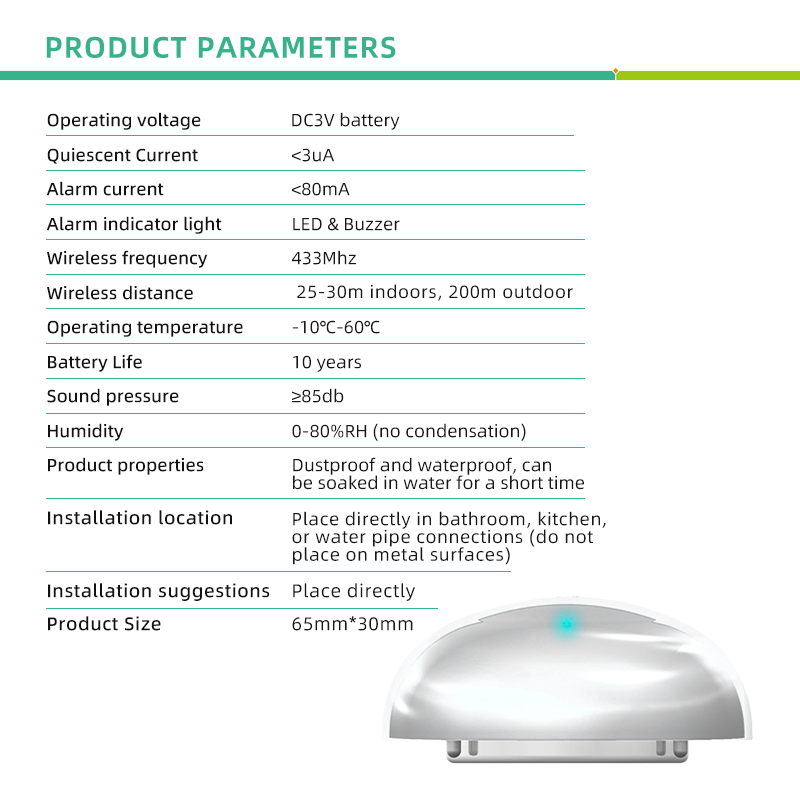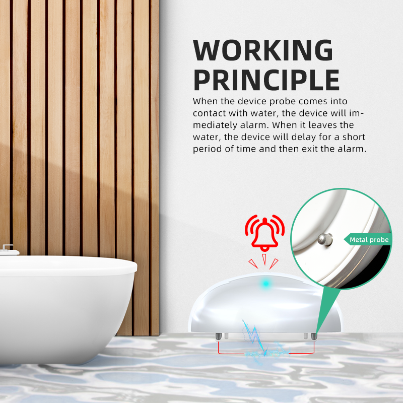 1 Water Leakage Alarm: The leaking rope electrode detects liquid, the sensor will make a beep sound, and the LED light will flash at the same time. During this period, press the button, the sensor will enter the mute state for 10 minutes, at this time only the LED light flashes. (This mute effect is only valid for this alarm)