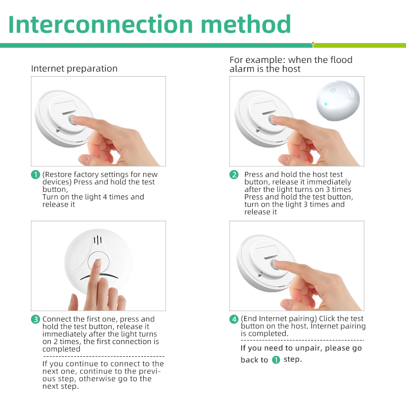 3 Mute: Press the button, the LED flashes twice and then let go, the LED flashes 3 times and then enters the mute state, which lasts for 10 minutes. During this period, the sensor will not make a sound when an alarm occurs or a test is performed.